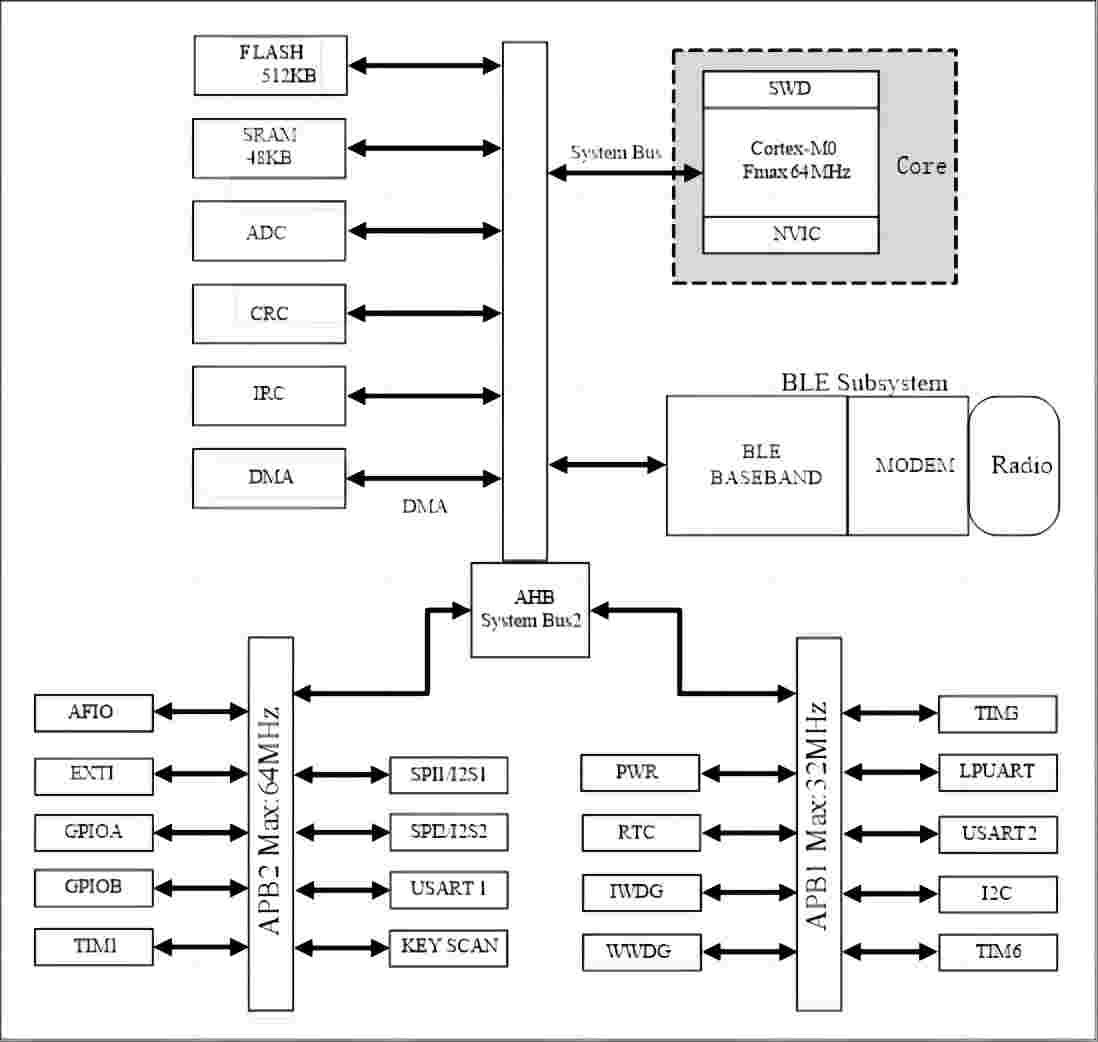 集成先進的BLE5.1射頻收發器,符合藍牙BLE5.1規范,可配置為標準的1MbpsBLE模式,2Mbps增強BLE模式,125kbps BLE遠程模式(S8),500kbps BLE遠程模式(S2)。在BLE1M或2M模式下,支持AOA(到達角)和AOD(離去角),支持RSSI(接收器信號強度指示),支持主從角色,支持多連接,支持數據包長度擴展,支持KEYSCAN,IRC,10位1.33Msps ADC(可配置為16位16Ksps),支持模擬MIC輸入,PGA放大,支持基本、通用、高級TIMER,RTC,WWDG,IWDG,LPUART,USART,SPI,I2C等外設。適用于藍牙KEY,OBU,數傳模塊,藍牙語音遙控器,智能家居等多種應用場景。