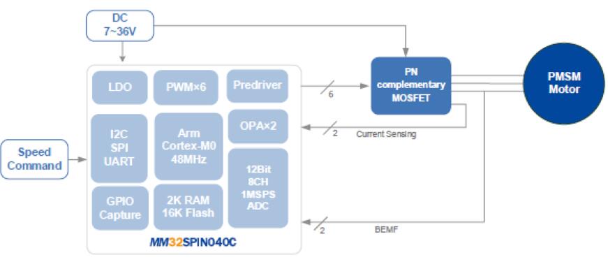 方案采用的主控MM32SPIN040工作頻率可達(dá)48MHz,內(nèi)置16KB Flash,2KB SRAM高速存儲(chǔ)器,針對(duì)電機(jī)應(yīng)用內(nèi)置2個(gè)運(yùn)放,預(yù)驅(qū)工作電壓高達(dá)36V。適合于三相永磁無刷電機(jī),電動(dòng)工具等多種應(yīng)用場(chǎng)合。該方案適用于落地扇、塔扇、循環(huán)扇、吊扇等多種品類的風(fēng)扇設(shè)備。我司英尚微可提供高速吹風(fēng)筒、電扇等各種電機(jī)應(yīng)用方案。