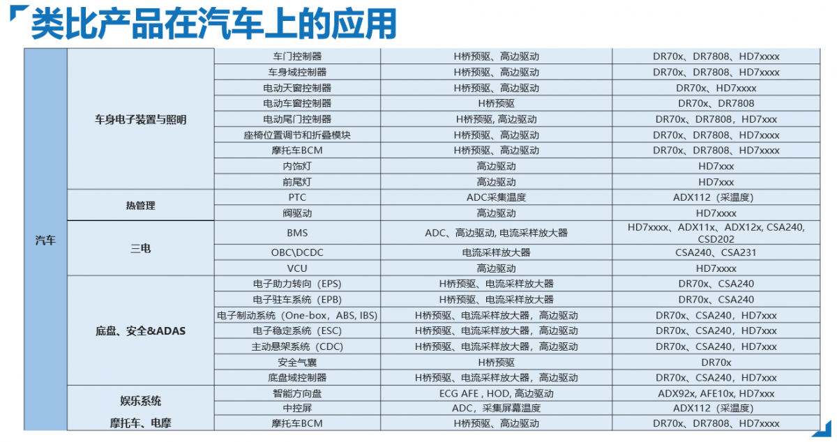 類比半導(dǎo)體高邊驅(qū)動(dòng)產(chǎn)品可用于驅(qū)動(dòng)車(chē)身控制域中的各種阻性、感性及容性負(fù)載的驅(qū)動(dòng),其在車(chē)內(nèi)外的應(yīng)用非常廣泛,包括車(chē)內(nèi)飾燈、頭尾燈、座椅和方向盤(pán)及后視鏡加熱、電磁閥、門(mén)鎖、電機(jī)等場(chǎng)景。