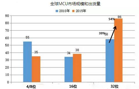 IC Insights研究報告顯示,2015年全球MCU市場規模達到168億美元,較去年增長5.6%,出貨量255億顆比去年提升12.4%,預計2016年全球MCU市場出貨量將突破300億顆大關。其中,2015年全球32位MCU出貨量超過4/8位MCU與16位MCU出貨量的總和,而且未來幾年應該會保持30%左右的高速增長的水平。