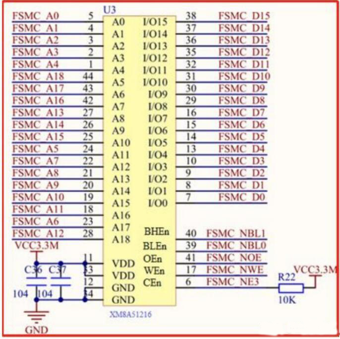 圖中A0~18為地址線,總共19根地址線(即2^19=512K,1K=1024);DQ0~15為數據線,總共16根數據線。CEn是芯片使能信號,低電平有效;OEn是輸出使能信號,低電平有效;WEn是寫使能信號,低電平有效;BLEn和BHEn分別是高字節控制和低字節控制信號;STM32F4開發板使用的是TSOP44封裝的XM8A51216芯片,該芯片直接接在STM32F4的FSMC上,XM8A51216原理圖如圖2所示: