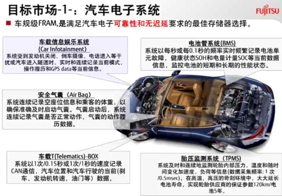 富士通FRAM早已能適用如汽車安全氣囊數據信息存儲(Airbag)、安全事故數據信息記錄軟件(EDR)、充電電池智能管理系統(BMS)、新能源汽車全車自動控制系統(VCU),新能源汽車CAN小盒子(CAN-BOX)、新能源汽車載終端設備(T-BOX)、胎壓監測裝置(TPMS)、車輛駕駛輔助系統軟件(ADAS)及導航欄與信息內容車載多媒體(infotainment)等運用中的即時且不斷的數據信息存儲,所以能減少系統軟件復雜性并提升數據庫安全,。