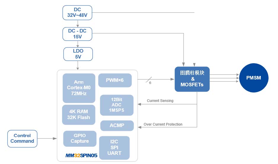 MM32SPIN080C是靈動MindSPIN旗下高性能的單電機控制SOC產(chǎn)品,采用Cortex-M0內(nèi)核,集成了運動控制所需的專用模擬外設(shè),包括12位高精度ADC、2路模擬比較器COMP、2路運算放大器OPAMP、三相N溝道柵極驅(qū)動器,另配備有MC-TIM、硬件除法器HW-Div、DMA控制器等專用資源,以及32KB Flash、4KB SRAM、20個GPIO等基礎(chǔ)資源。