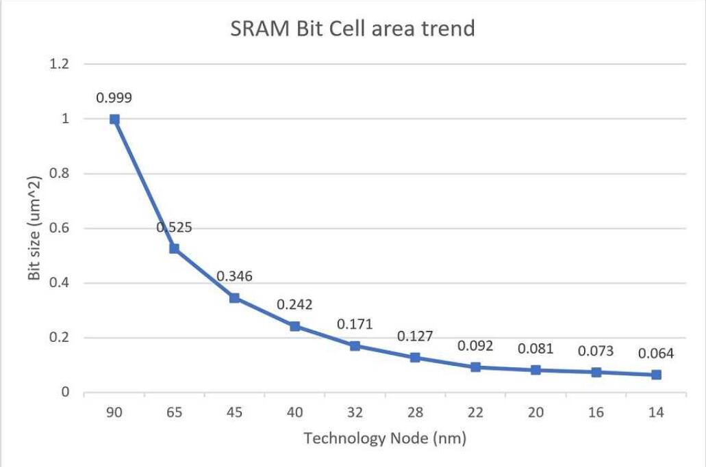 圖2位單元趨勢顯示隨著過程節點縮小,縮放比例逐漸減小。