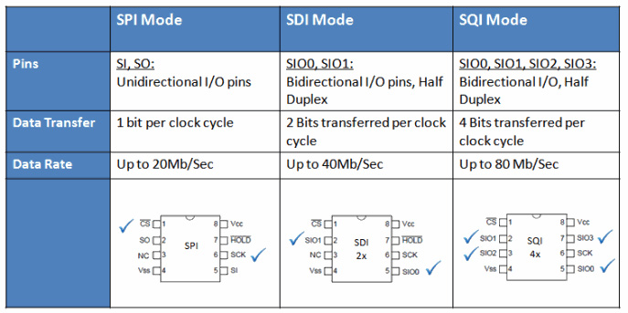 SQI模式下,全部4個引腳(引腳2、4、5和7)均配置為可隨時高效進行讀或寫操作,確保在一個時鐘周期內通過總線傳輸4位,這實際上會獲得4倍數據速率。例如,標準SPI模式下需花費40個時鐘周期才能完成的任務現在可以在40/4 = 10個時鐘周期內完成。 需要快速傳輸大量數據時,該功能十分有用。